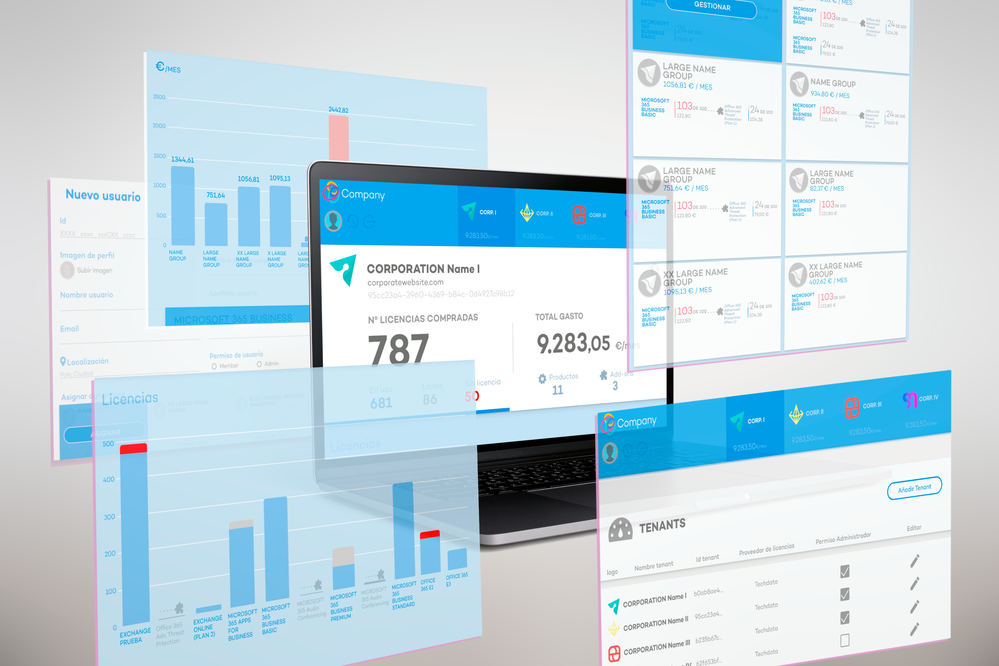 Dashboard design based on cards, it can be navigated and managed by groups and/or by type of license (product). It consists of bar graphs to better visualize the cost and use of licenses. Management of permits, purchase and assignment of visual and intuitive licenses.