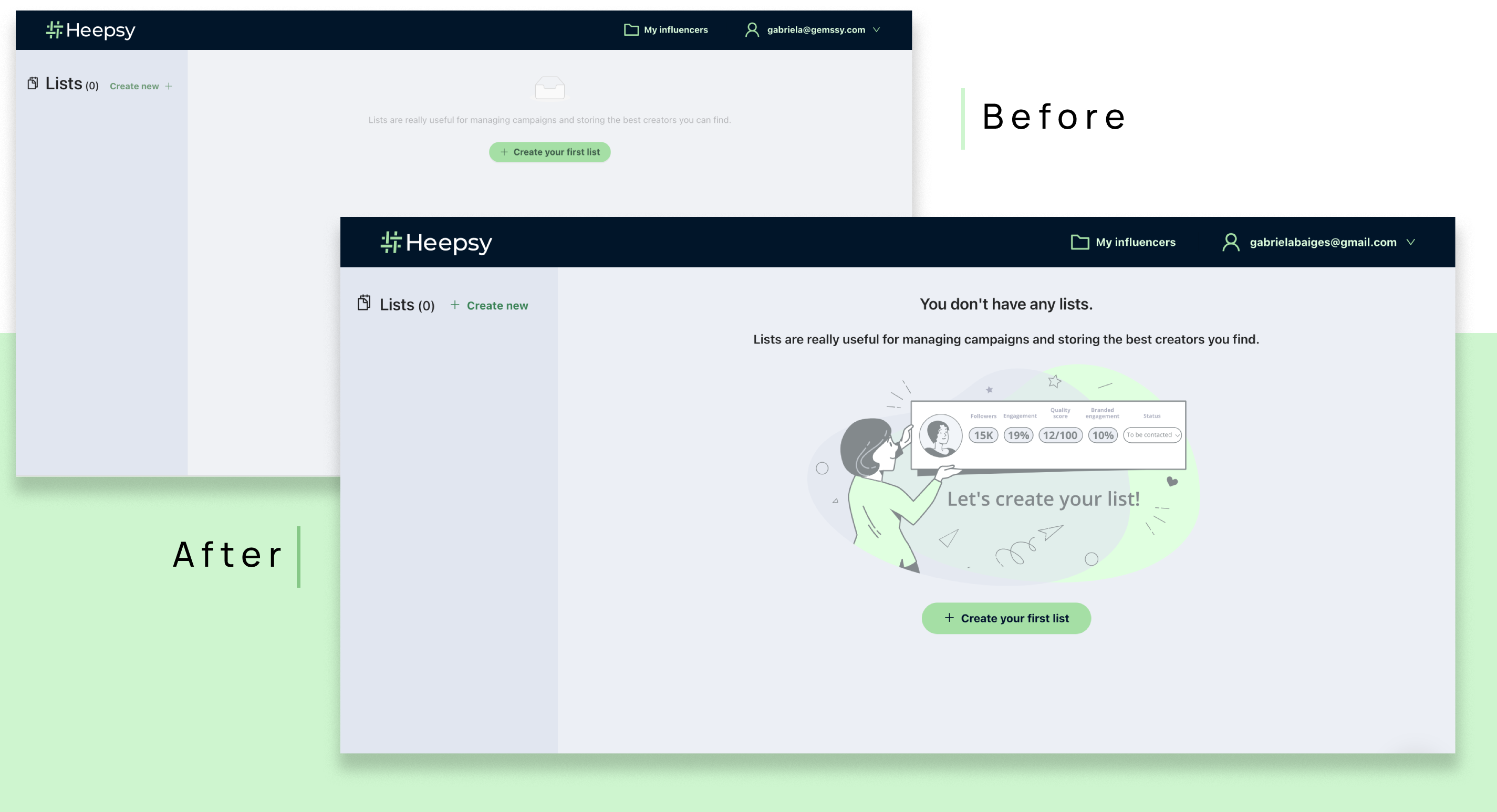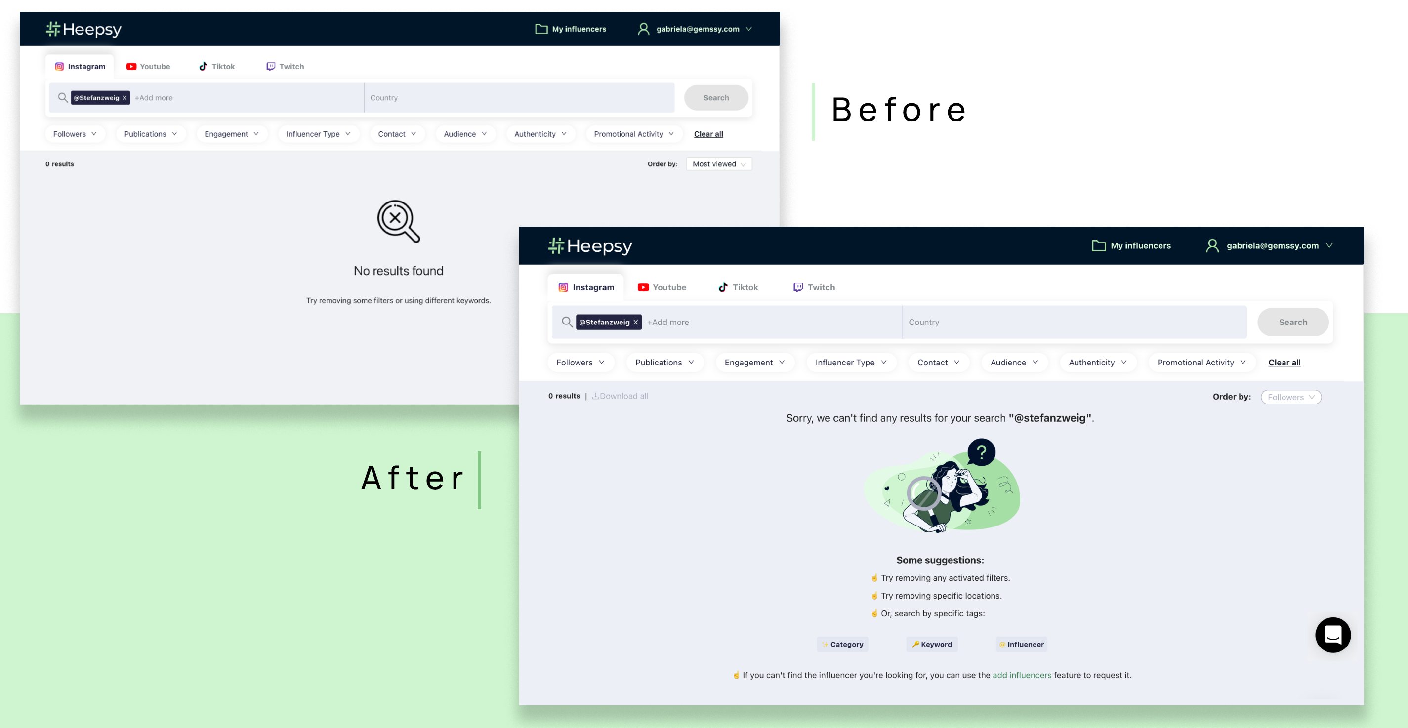 In Heepsy search engine experience, the user can use many filters and create their own influencer lists, analyze profiles… but what happens on that rare occasion when there is nothing around the user or an error happens? For this design iteration in Heepsy I focused and determined the following states.